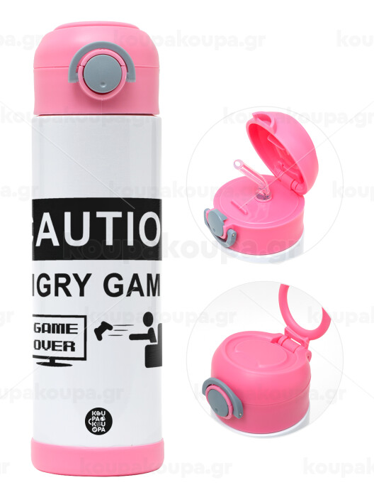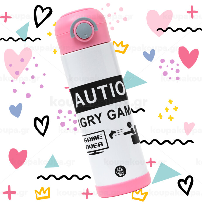 Caution, angry gamer!, Πασχαλινή Λαμπάδα με Παιδικό παγούρι θερμό, ανοξείδωτο, με καλαμάκι ασφαλείας, ΡΟΖ (500ml)