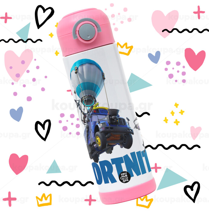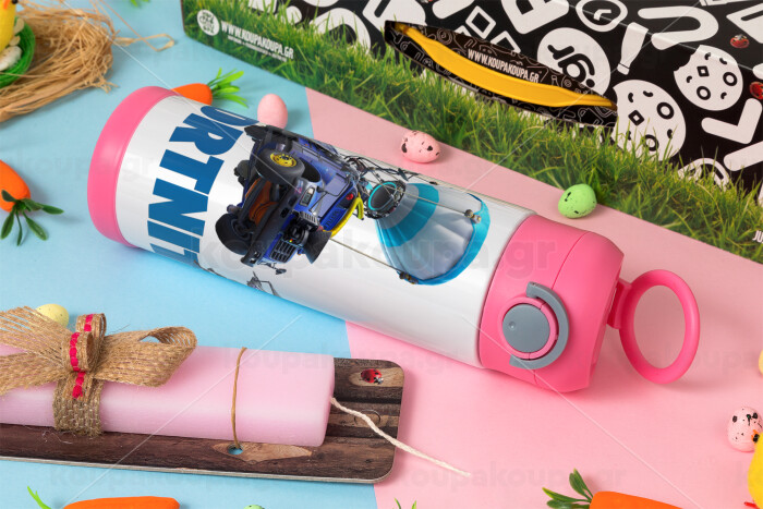 Fortnite Bus, Πασχαλινή Λαμπάδα με Παιδικό παγούρι θερμό, ανοξείδωτο, με καλαμάκι ασφαλείας, ΡΟΖ (500ml)