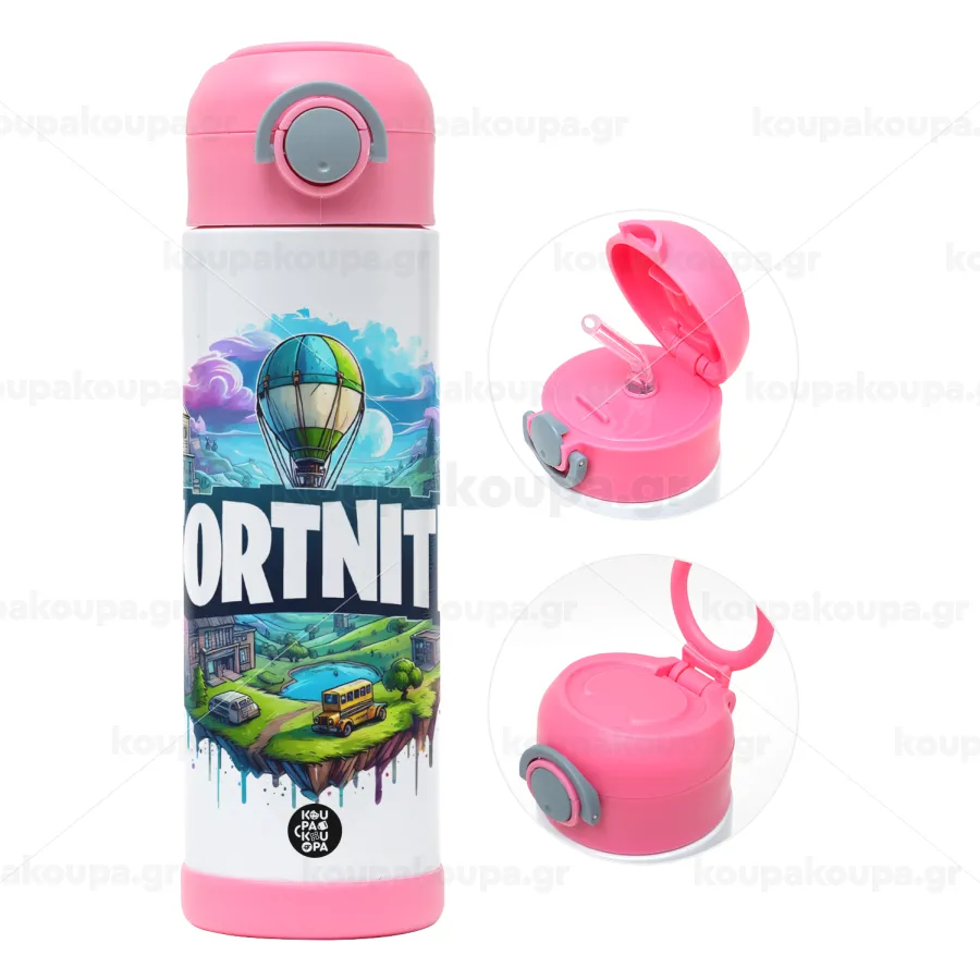Fortnite land, Πασχαλινή Λαμπάδα με Παιδικό παγούρι θερμό, ανοξείδωτο, με καλαμάκι ασφαλείας, ΡΟΖ (500ml)