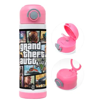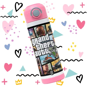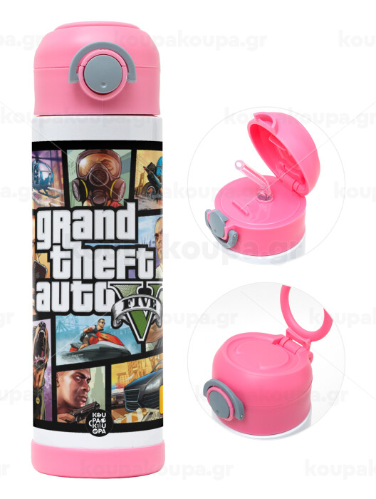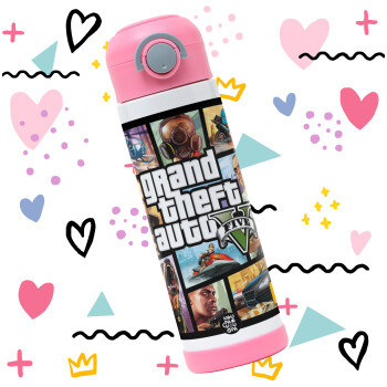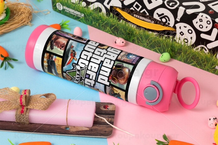 GTA V, Πασχαλινή Λαμπάδα με Παιδικό παγούρι θερμό, ανοξείδωτο, με καλαμάκι ασφαλείας, ΡΟΖ (500ml)
