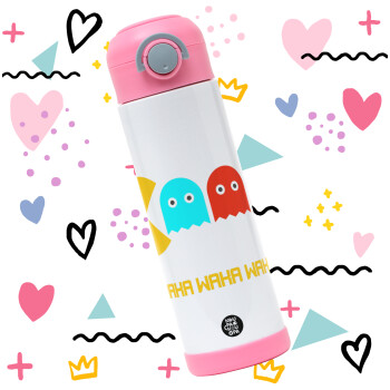 Pacman waka waka waka, Πασχαλινή Λαμπάδα με Παιδικό παγούρι θερμό, ανοξείδωτο, με καλαμάκι ασφαλείας, ΡΟΖ (500ml)