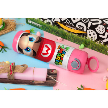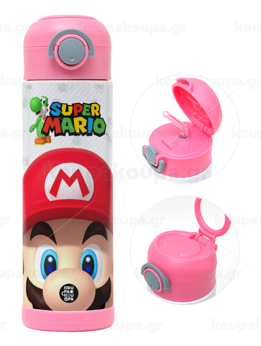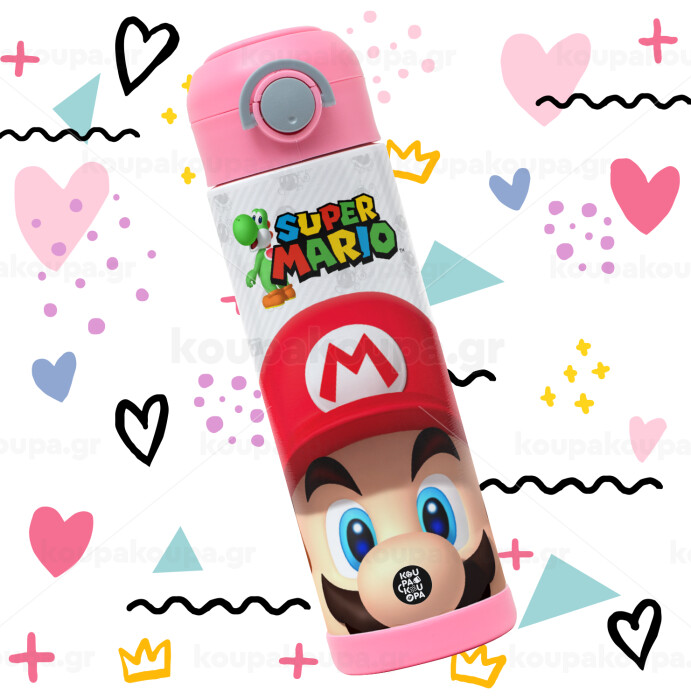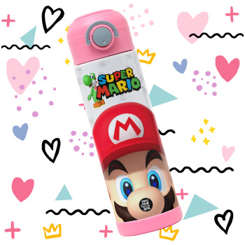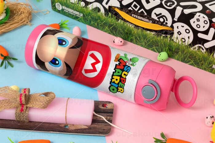 Super mario, Πασχαλινή Λαμπάδα με Παιδικό παγούρι θερμό, ανοξείδωτο, με καλαμάκι ασφαλείας, ΡΟΖ (500ml)