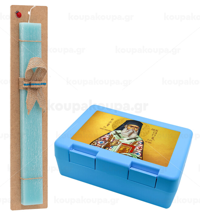 Άγιος Νεκτάριος, Πασχαλινή Λαμπάδα με παιδικό δοχείο κολατσιού ΓΑΛΑΖΙΟ & κερί αρωματικό πλακέ (30cm) (ΤΙΡΚΟΥΑΖ)