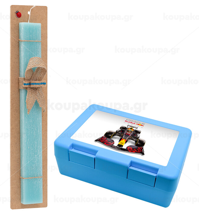 Redbull Racing Team F1, Πασχαλινή Λαμπάδα με παιδικό δοχείο κολατσιού ΓΑΛΑΖΙΟ & κερί αρωματικό πλακέ (30cm) (ΤΙΡΚΟΥΑΖ)