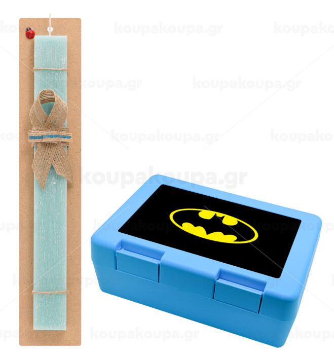 Batman, Πασχαλινή Λαμπάδα με παιδικό δοχείο κολατσιού ΓΑΛΑΖΙΟ & κερί αρωματικό πλακέ (30cm) (ΤΙΡΚΟΥΑΖ)