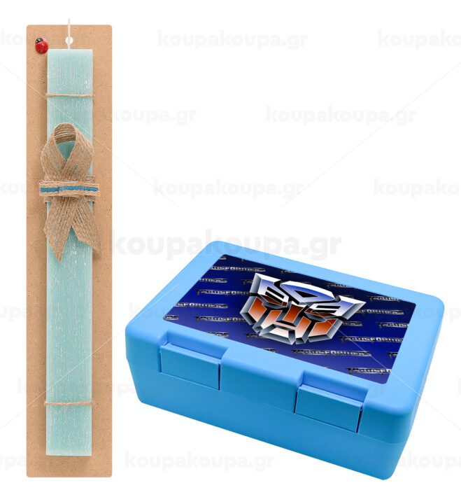 Transformers, Πασχαλινή Λαμπάδα με παιδικό δοχείο κολατσιού ΓΑΛΑΖΙΟ & κερί αρωματικό πλακέ (30cm) (ΤΙΡΚΟΥΑΖ)
