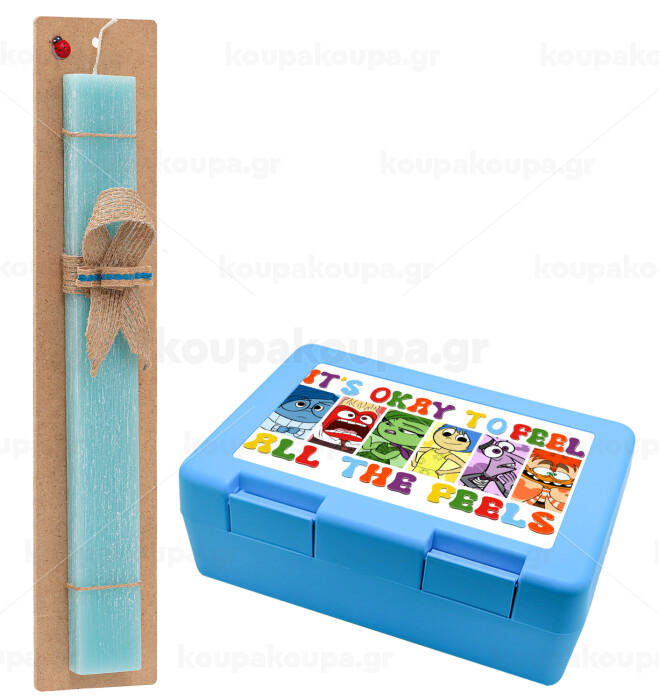 Inside Out It's Okay To Feel All The Feels , Πασχαλινή Λαμπάδα με παιδικό δοχείο κολατσιού ΓΑΛΑΖΙΟ & κερί αρωματικό πλακέ (30cm) (ΤΙΡΚΟΥΑΖ)
