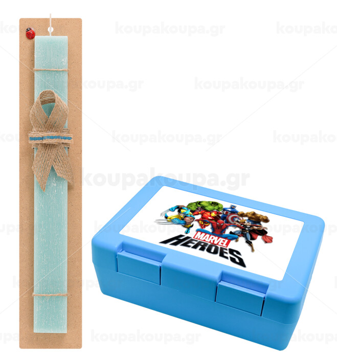 MARVEL heroes, Πασχαλινή Λαμπάδα με παιδικό δοχείο κολατσιού ΓΑΛΑΖΙΟ & κερί αρωματικό πλακέ (30cm) (ΤΙΡΚΟΥΑΖ)