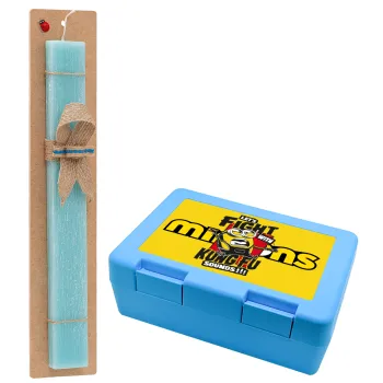 Minions Let's fight with kung fu sounds, Πασχαλινή Λαμπάδα με παιδικό δοχείο κολατσιού ΓΑΛΑΖΙΟ & κερί αρωματικό πλακέ (30cm) (ΤΙΡΚΟΥΑΖ)