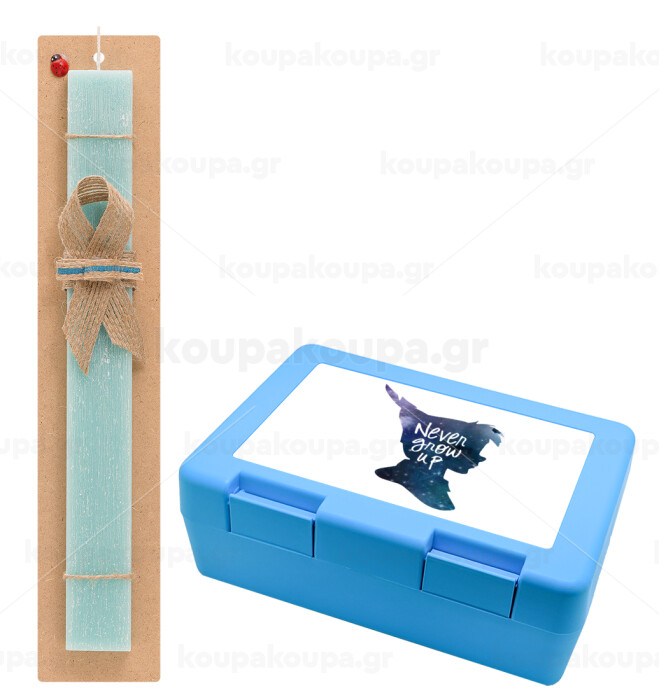 Never Grow UP, Πασχαλινή Λαμπάδα με παιδικό δοχείο κολατσιού ΓΑΛΑΖΙΟ & κερί αρωματικό πλακέ (30cm) (ΤΙΡΚΟΥΑΖ)