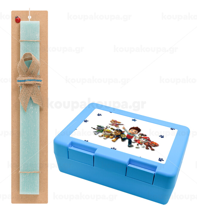 paw patrol, Πασχαλινή Λαμπάδα με παιδικό δοχείο κολατσιού ΓΑΛΑΖΙΟ & κερί αρωματικό πλακέ (30cm) (ΤΙΡΚΟΥΑΖ)