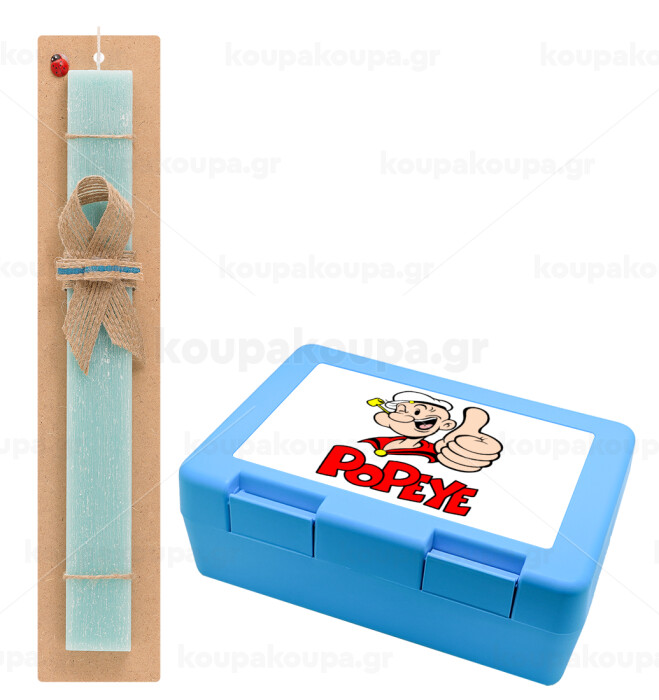 Popeye the sailor man, Πασχαλινή Λαμπάδα με παιδικό δοχείο κολατσιού ΓΑΛΑΖΙΟ & κερί αρωματικό πλακέ (30cm) (ΤΙΡΚΟΥΑΖ)