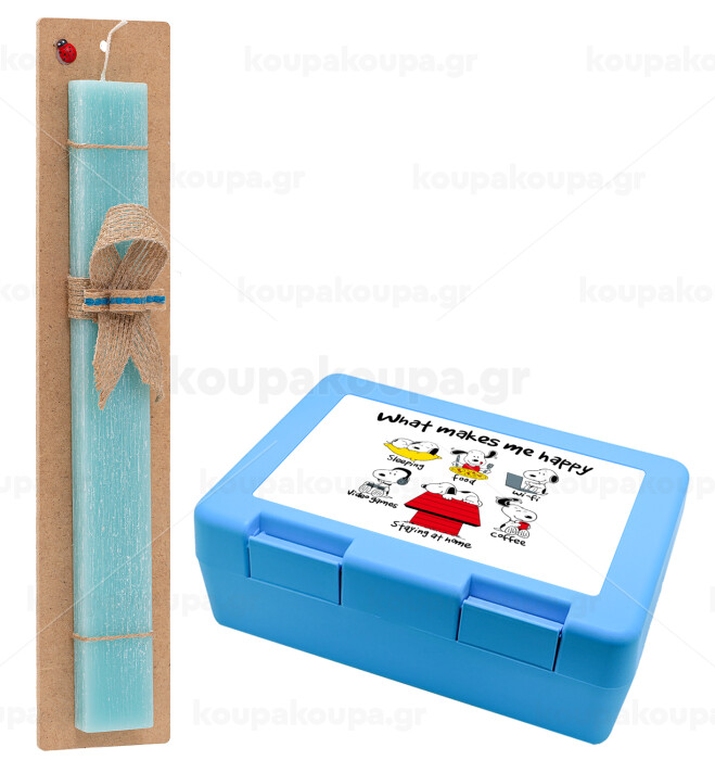 Snoopy what makes my happy, Πασχαλινή Λαμπάδα με παιδικό δοχείο κολατσιού ΓΑΛΑΖΙΟ & κερί αρωματικό πλακέ (30cm) (ΤΙΡΚΟΥΑΖ)