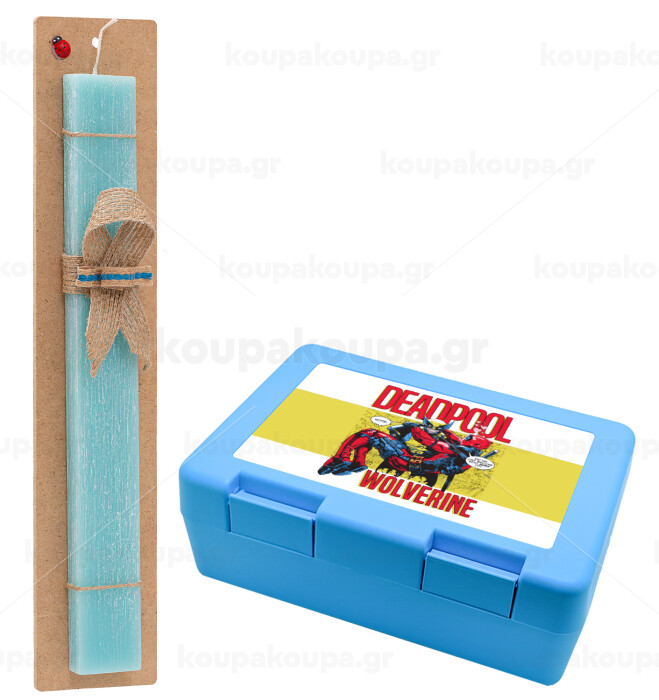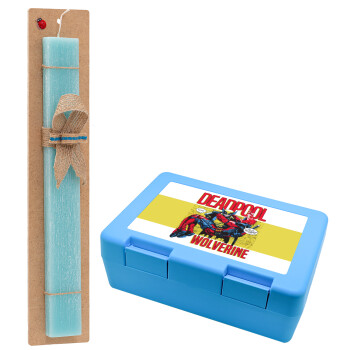 Superhero Deadpool Wolverine, Πασχαλινή Λαμπάδα με παιδικό δοχείο κολατσιού ΓΑΛΑΖΙΟ & κερί αρωματικό πλακέ (30cm) (ΤΙΡΚΟΥΑΖ)