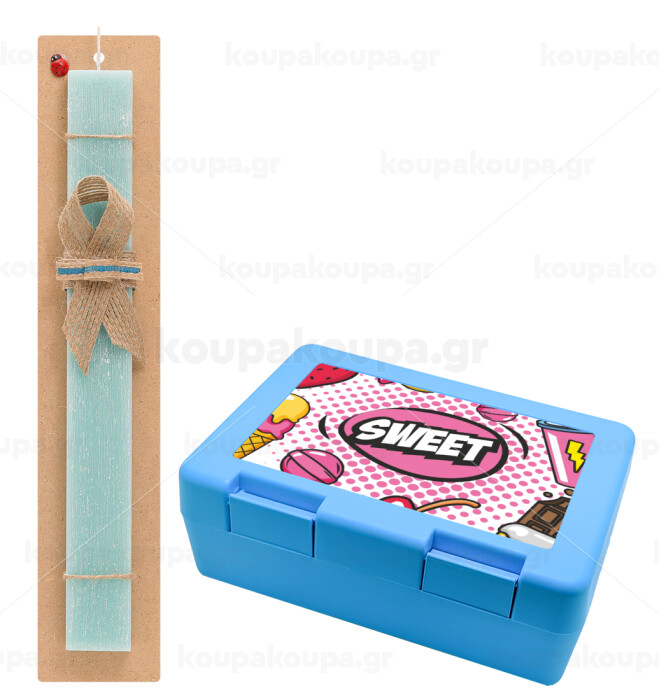 SWEET, Πασχαλινή Λαμπάδα με παιδικό δοχείο κολατσιού ΓΑΛΑΖΙΟ & κερί αρωματικό πλακέ (30cm) (ΤΙΡΚΟΥΑΖ)