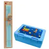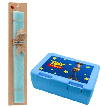 Woody cowboy, Πασχαλινή Λαμπάδα με παιδικό δοχείο κολατσιού ΓΑΛΑΖΙΟ & κερί αρωματικό πλακέ (30cm) (ΤΙΡΚΟΥΑΖ)