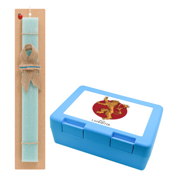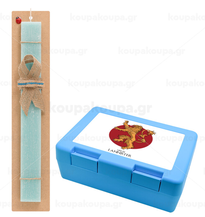 House Lannister GOT, Πασχαλινή Λαμπάδα με παιδικό δοχείο κολατσιού ΓΑΛΑΖΙΟ & κερί αρωματικό πλακέ (30cm) (ΤΙΡΚΟΥΑΖ)
