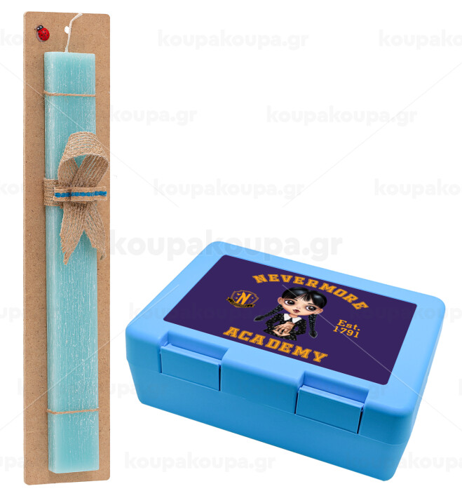 Wednesday Adams, nevermore, Πασχαλινή Λαμπάδα με παιδικό δοχείο κολατσιού ΓΑΛΑΖΙΟ & κερί αρωματικό πλακέ (30cm) (ΤΙΡΚΟΥΑΖ)