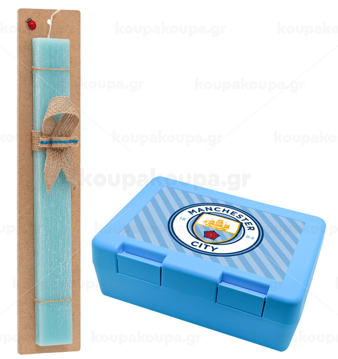 Manchester City FC , Πασχαλινή Λαμπάδα με παιδικό δοχείο κολατσιού ΓΑΛΑΖΙΟ & κερί αρωματικό πλακέ (30cm) (ΤΙΡΚΟΥΑΖ)