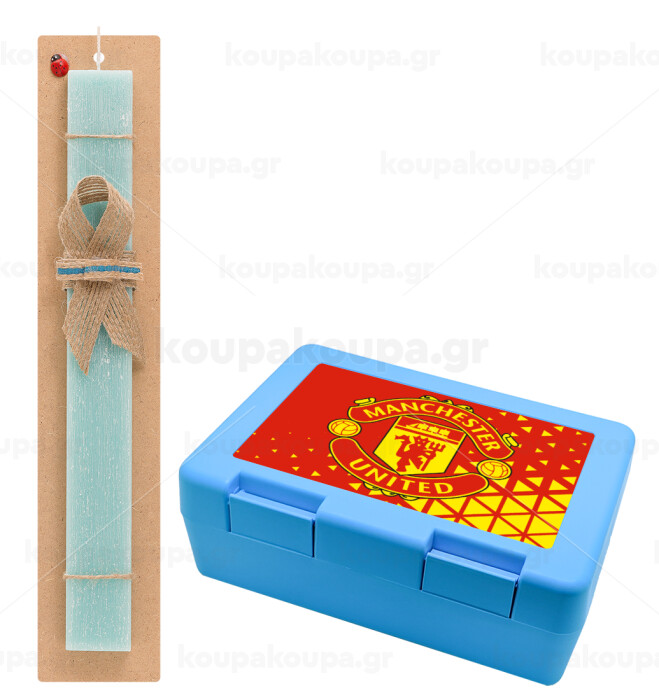 Manchester United F.C., Πασχαλινή Λαμπάδα με παιδικό δοχείο κολατσιού ΓΑΛΑΖΙΟ & κερί αρωματικό πλακέ (30cm) (ΤΙΡΚΟΥΑΖ)