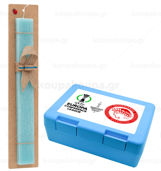Ολυμπιακός νικητής UEFA Europa Conference League Champion 2023/24, Πασχαλινή Λαμπάδα με παιδικό δοχείο κολατσιού ΓΑΛΑΖΙΟ & κερί αρωματικό πλακέ (30cm) (ΤΙΡΚΟΥΑΖ)