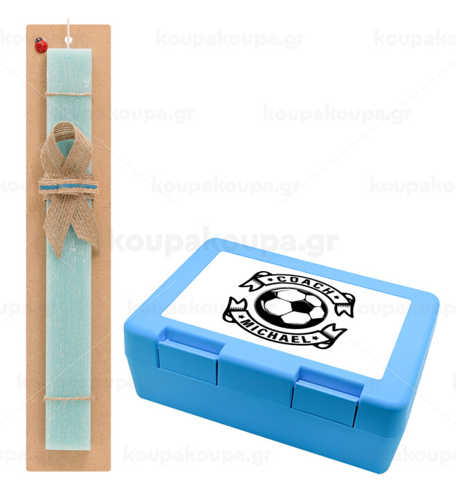 Soccer coach, Πασχαλινή Λαμπάδα με παιδικό δοχείο κολατσιού ΓΑΛΑΖΙΟ & κερί αρωματικό πλακέ (30cm) (ΤΙΡΚΟΥΑΖ)