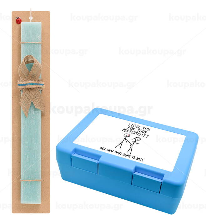 I Love you for your personality, Πασχαλινή Λαμπάδα με παιδικό δοχείο κολατσιού ΓΑΛΑΖΙΟ & κερί αρωματικό πλακέ (30cm) (ΤΙΡΚΟΥΑΖ)