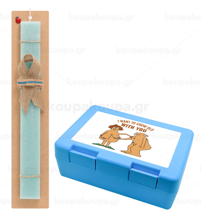 I want to grow old with you, Πασχαλινή Λαμπάδα με παιδικό δοχείο κολατσιού ΓΑΛΑΖΙΟ & κερί αρωματικό πλακέ (30cm) (ΤΙΡΚΟΥΑΖ)