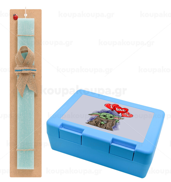 Yoda, i love you, Πασχαλινή Λαμπάδα με παιδικό δοχείο κολατσιού ΓΑΛΑΖΙΟ & κερί αρωματικό πλακέ (30cm) (ΤΙΡΚΟΥΑΖ)