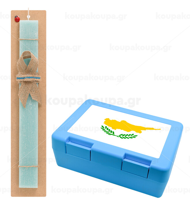 Cyprus flag, Πασχαλινή Λαμπάδα με παιδικό δοχείο κολατσιού ΓΑΛΑΖΙΟ & κερί αρωματικό πλακέ (30cm) (ΤΙΡΚΟΥΑΖ)