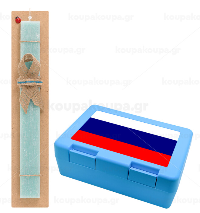 Russia flag, Πασχαλινή Λαμπάδα με παιδικό δοχείο κολατσιού ΓΑΛΑΖΙΟ & κερί αρωματικό πλακέ (30cm) (ΤΙΡΚΟΥΑΖ)