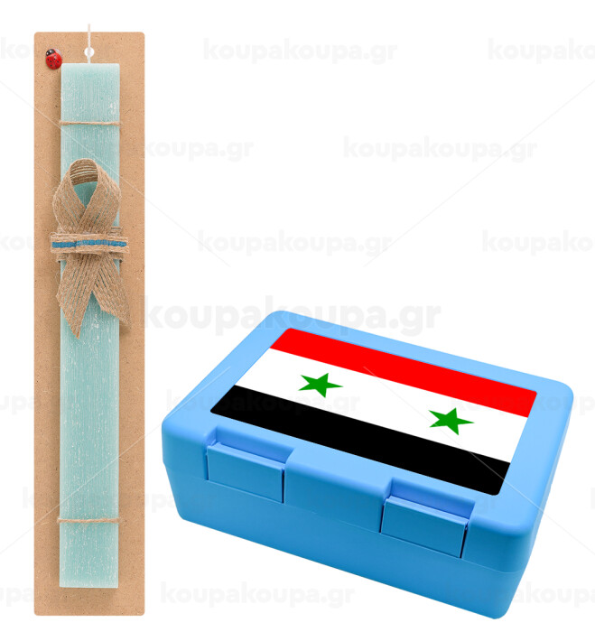Syria flag, Πασχαλινή Λαμπάδα με παιδικό δοχείο κολατσιού ΓΑΛΑΖΙΟ & κερί αρωματικό πλακέ (30cm) (ΤΙΡΚΟΥΑΖ)
