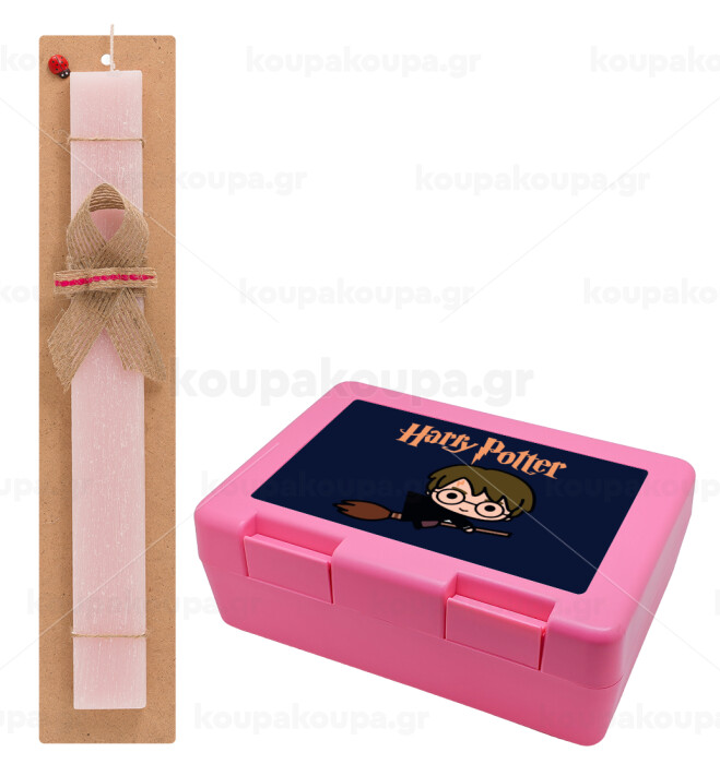 Harry potter kid, Πασχαλινή Λαμπάδα με παιδικό δοχείο κολατσιού ΡΟΖ & κερί αρωματικό πλακέ (30cm) (ΡΟΖ)