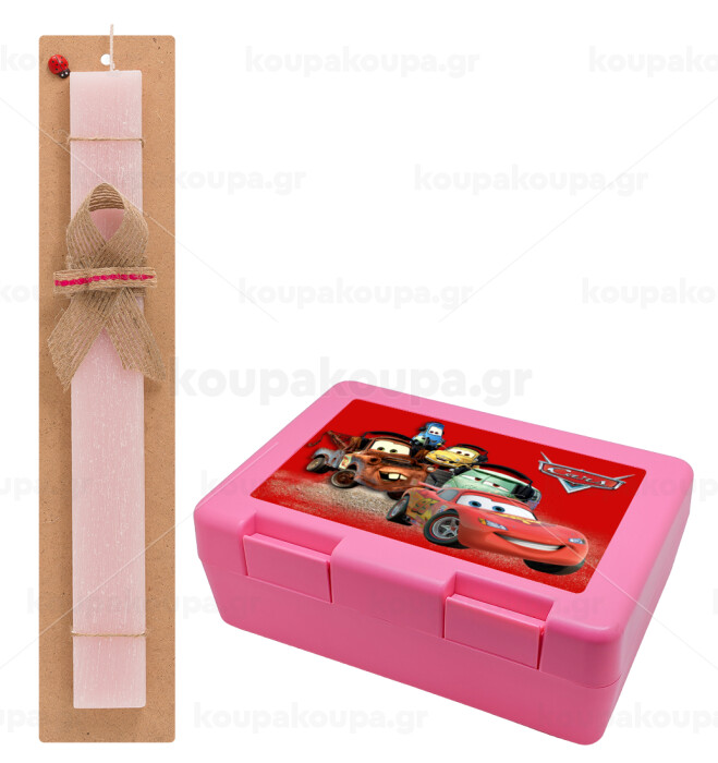 Αυτοκίνητα, Πασχαλινή Λαμπάδα με παιδικό δοχείο κολατσιού ΡΟΖ & κερί αρωματικό πλακέ (30cm) (ΡΟΖ)