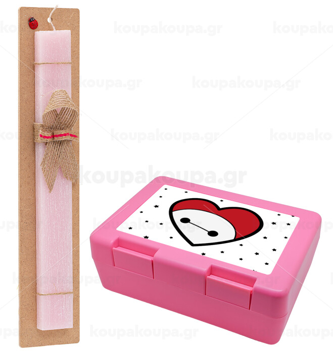 Baymax heart, Πασχαλινή Λαμπάδα με παιδικό δοχείο κολατσιού ΡΟΖ & κερί αρωματικό πλακέ (30cm) (ΡΟΖ)