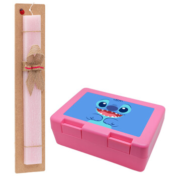 Lilo & Stitch blue, Πασχαλινή Λαμπάδα με παιδικό δοχείο κολατσιού ΡΟΖ & κερί αρωματικό πλακέ (30cm) (ΡΟΖ)