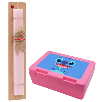 Lilo & Stitch blue, Πασχαλινή Λαμπάδα με παιδικό δοχείο κολατσιού ΡΟΖ & κερί αρωματικό πλακέ (30cm) (ΡΟΖ)