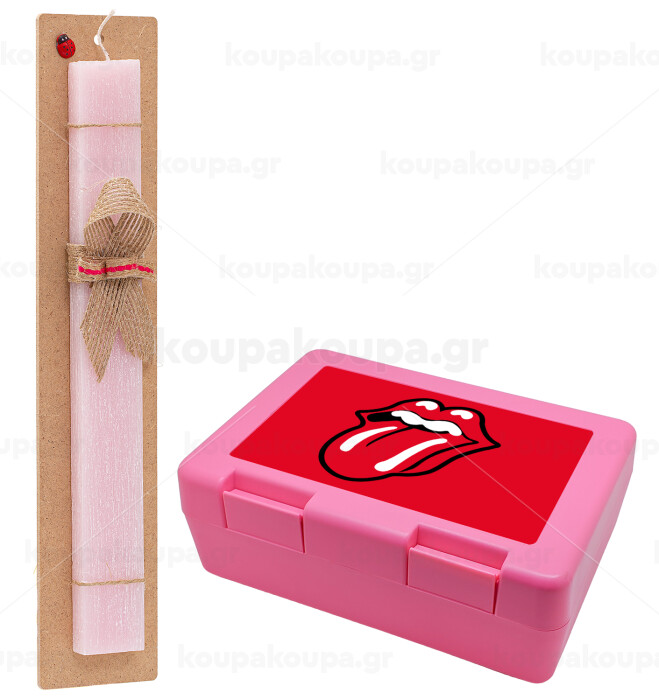 Rolling Stones Kiss, Πασχαλινή Λαμπάδα με παιδικό δοχείο κολατσιού ΡΟΖ & κερί αρωματικό πλακέ (30cm) (ΡΟΖ)