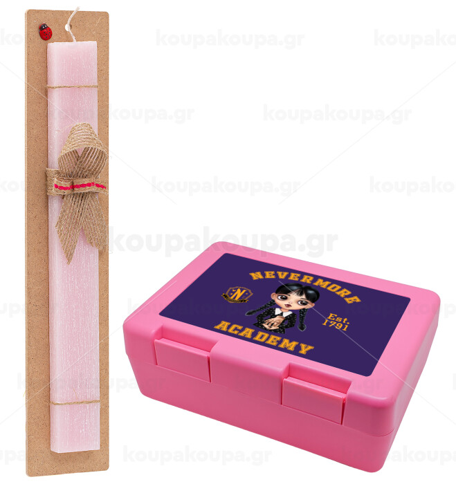 Wednesday Adams, nevermore, Πασχαλινή Λαμπάδα με παιδικό δοχείο κολατσιού ΡΟΖ & κερί αρωματικό πλακέ (30cm) (ΡΟΖ)