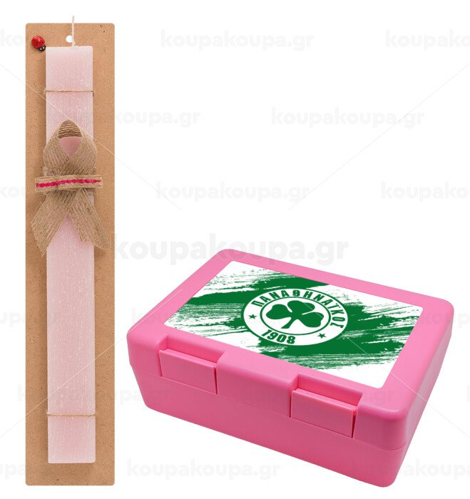 Π.Α.Ο., Πασχαλινή Λαμπάδα με παιδικό δοχείο κολατσιού ΡΟΖ & κερί αρωματικό πλακέ (30cm) (ΡΟΖ)