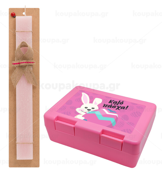 Καλό πάσχα, Πασχαλινή Λαμπάδα με παιδικό δοχείο κολατσιού ΡΟΖ & κερί αρωματικό πλακέ (30cm) (ΡΟΖ)
