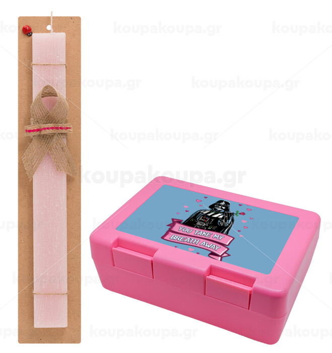 Darth Vader, you take my breath away, Πασχαλινή Λαμπάδα με παιδικό δοχείο κολατσιού ΡΟΖ & κερί αρωματικό πλακέ (30cm) (ΡΟΖ)
