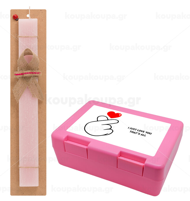 I just love you, that's all., Πασχαλινή Λαμπάδα με παιδικό δοχείο κολατσιού ΡΟΖ & κερί αρωματικό πλακέ (30cm) (ΡΟΖ)