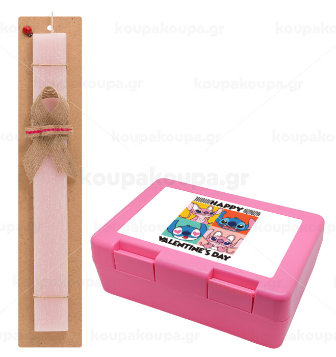 Lilo & Stitch Happy valentines day, Πασχαλινή Λαμπάδα με παιδικό δοχείο κολατσιού ΡΟΖ & κερί αρωματικό πλακέ (30cm) (ΡΟΖ)