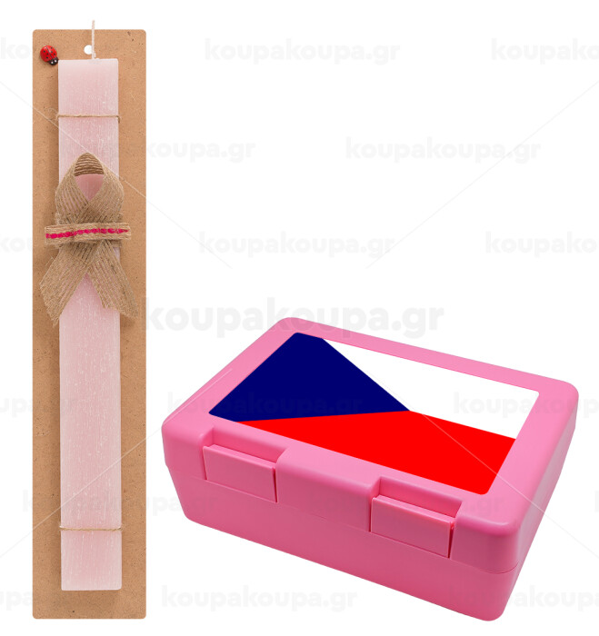 Czechia flag, Πασχαλινή Λαμπάδα με παιδικό δοχείο κολατσιού ΡΟΖ & κερί αρωματικό πλακέ (30cm) (ΡΟΖ)