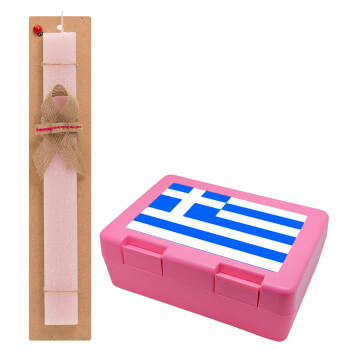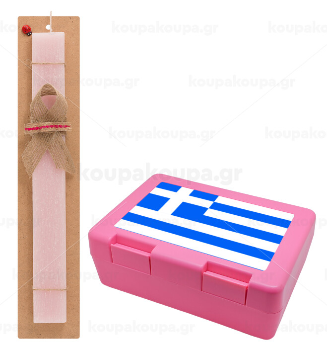 Greece flag, Πασχαλινή Λαμπάδα με παιδικό δοχείο κολατσιού ΡΟΖ & κερί αρωματικό πλακέ (30cm) (ΡΟΖ)