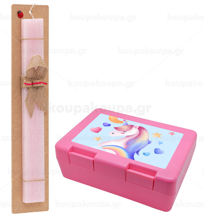 Μονόκερος, Πασχαλινή Λαμπάδα με παιδικό δοχείο κολατσιού ΡΟΖ & κερί αρωματικό πλακέ (30cm) (ΡΟΖ)