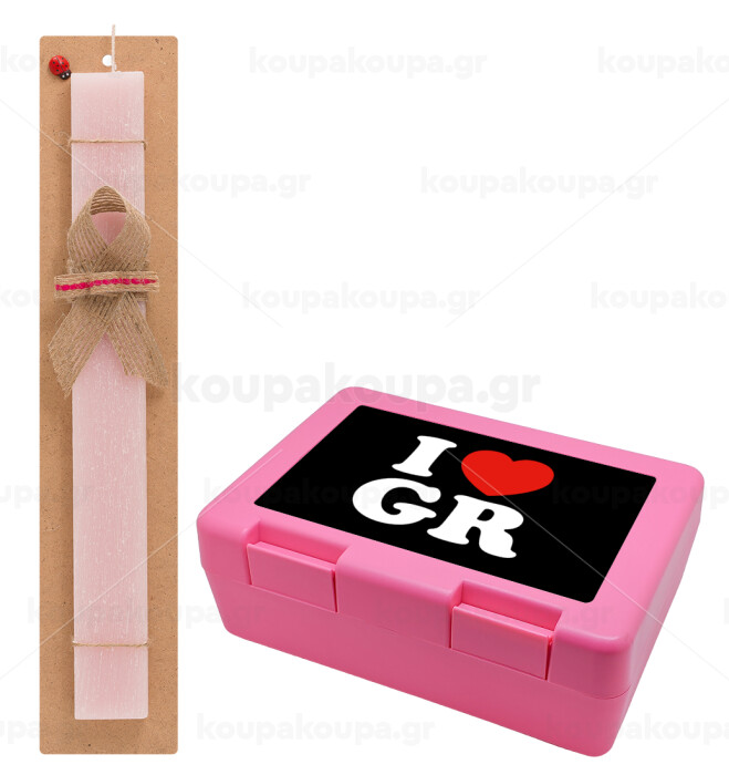 I Love GR, Πασχαλινή Λαμπάδα με παιδικό δοχείο κολατσιού ΡΟΖ & κερί αρωματικό πλακέ (30cm) (ΡΟΖ)