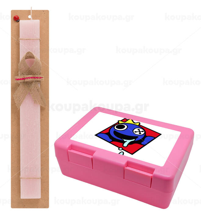 Blue, Rainbow friends, Πασχαλινή Λαμπάδα με παιδικό δοχείο κολατσιού ΡΟΖ & κερί αρωματικό πλακέ (30cm) (ΡΟΖ)