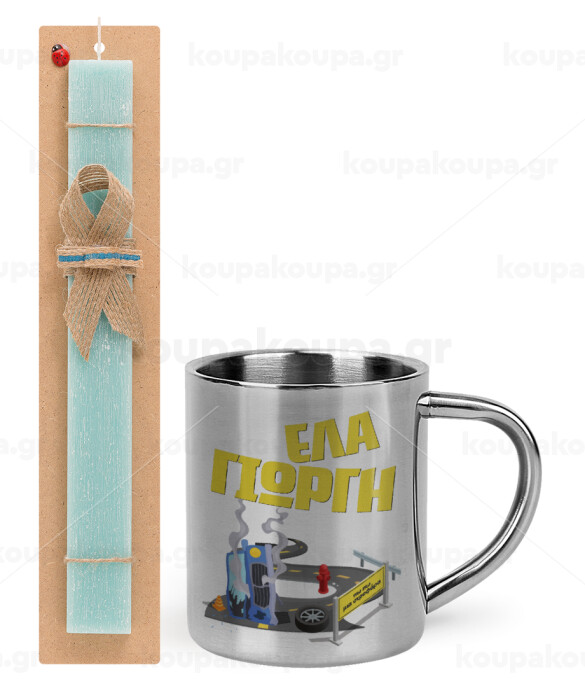 Έλα Γιώργη, πω πω μια στροφάρα, Πασχαλινή Λαμπάδα με μεταλλική κούπα θερμό (300ml) & κερί αρωματικό πλακέ (30cm) (ΤΙΡΚΟΥΑΖ)